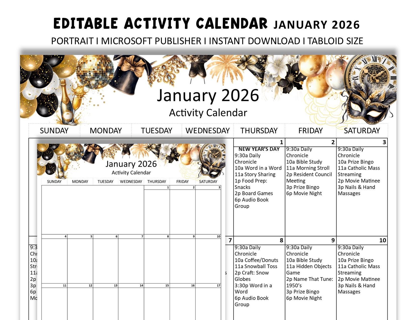 January 2026 Editable Monthly Activities Calendar For Senior Living Tabloid Size 17