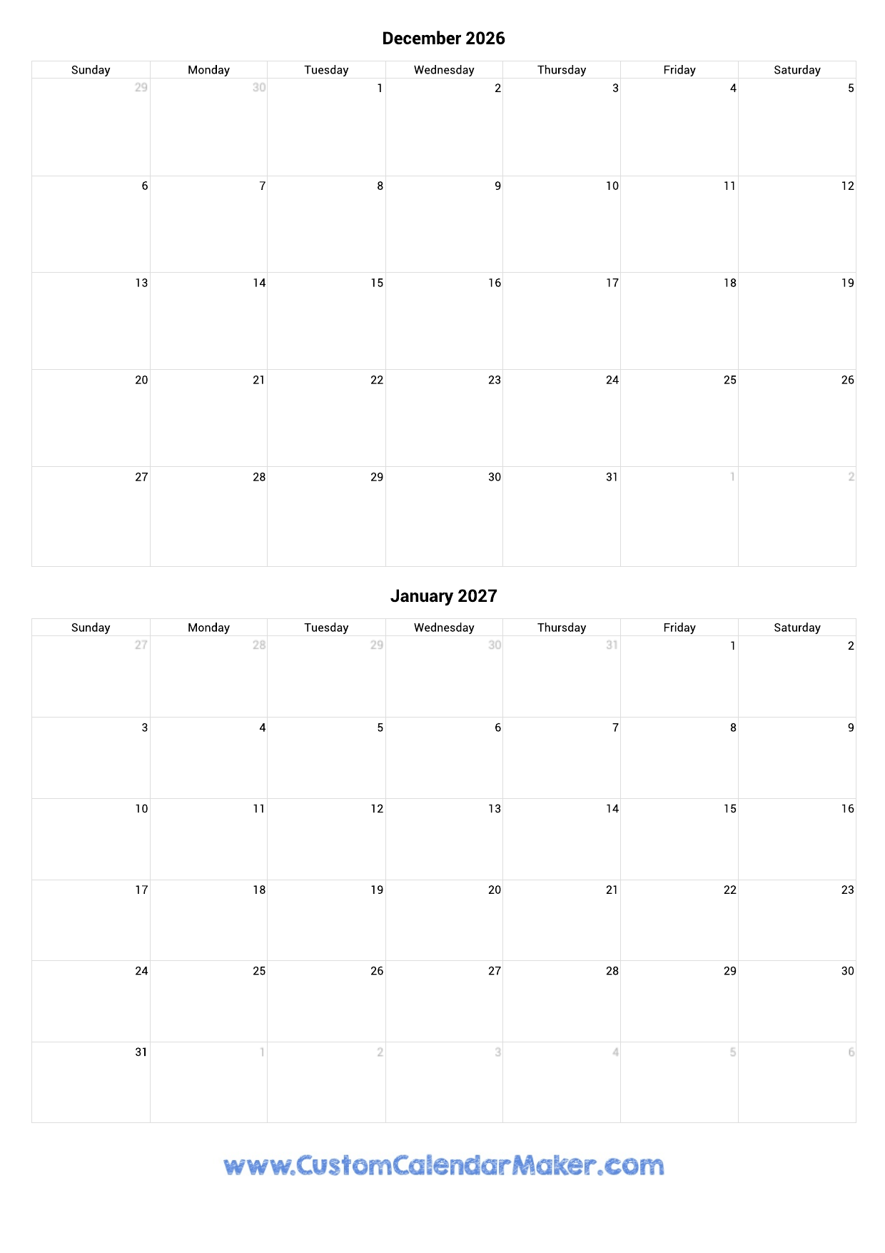 December 2026 And January 2027 Calendar Custom Calendar Maker