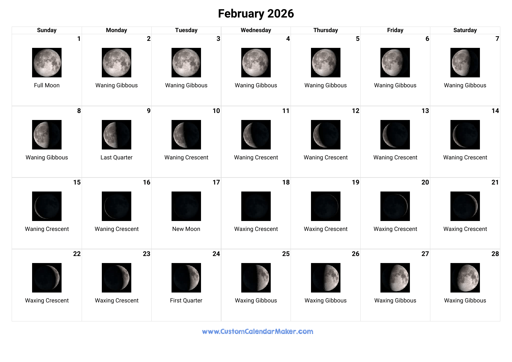 February 2026 Moon Phases Calendar Custom Calendar Maker