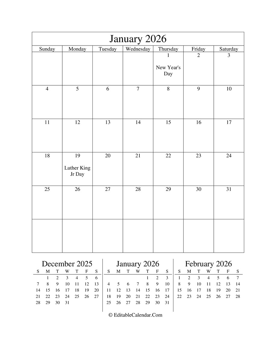 Don’t let the busyness of life overwhelm you – take control of your schedule with a fillable calendar for January 2026. Stay on top of your commitments, set goals, and make the most of your time. Download your template today and start planning for a successful month ahead.