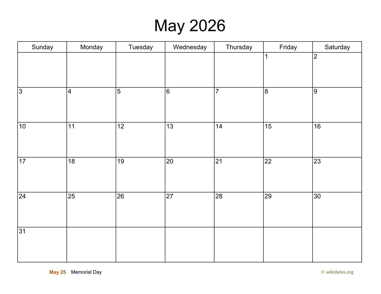 Basic Calendar For May 2026 WikiDates